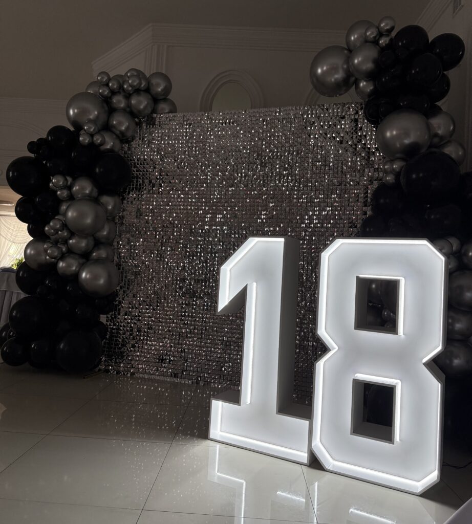 Wisienką na torcie były duże, podświetlane cyfry “18” – nie tylko przykuwały uwagę, ale też tworzyły świetny punkt do zdjęć i nadały całej dekoracji wyjątkowego charakteru.