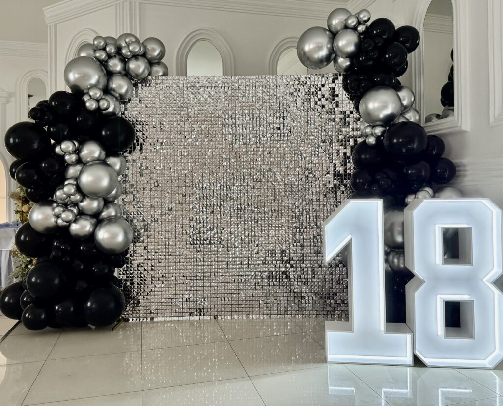 Motyw przewodni? Czerń, srebro i blask! Dominującym elementem była błyszcząca ścianka z cekinów, która idealnie odbijała światło, tworząc tło w stylu glamour. Po jej bokach znalazły się spektakularne girlandy balonowe w kolorach czerni i metalicznego srebra – połączenie elegancji z nowoczesnością, które nadało przestrzeni luksusowego charakteru.