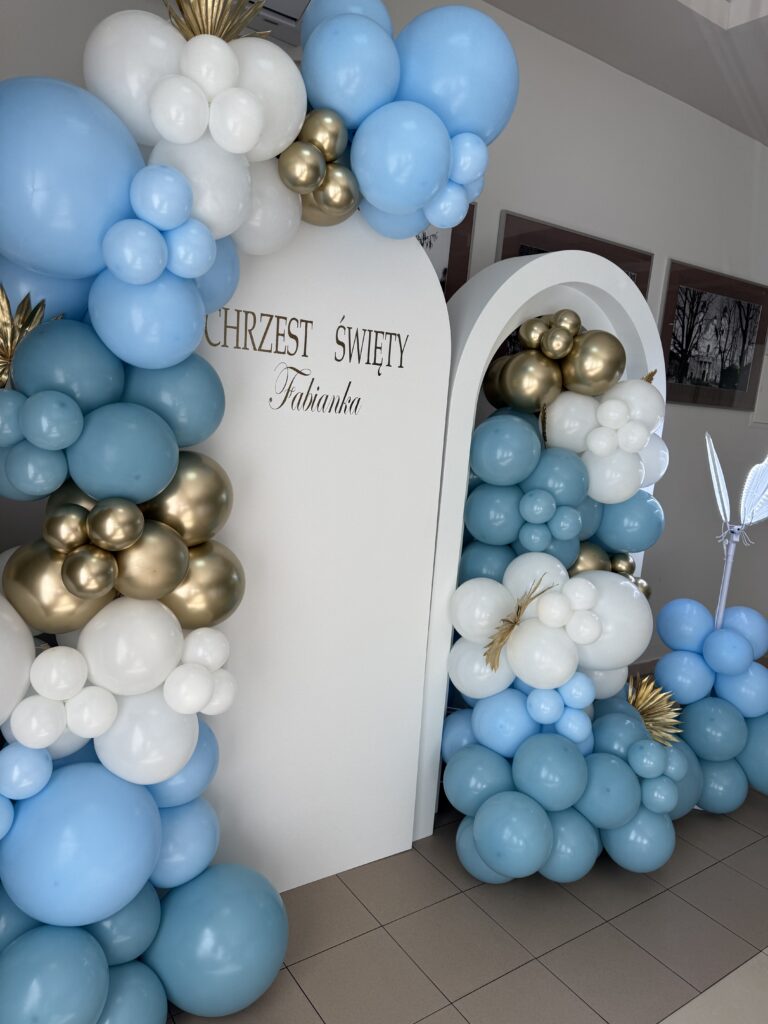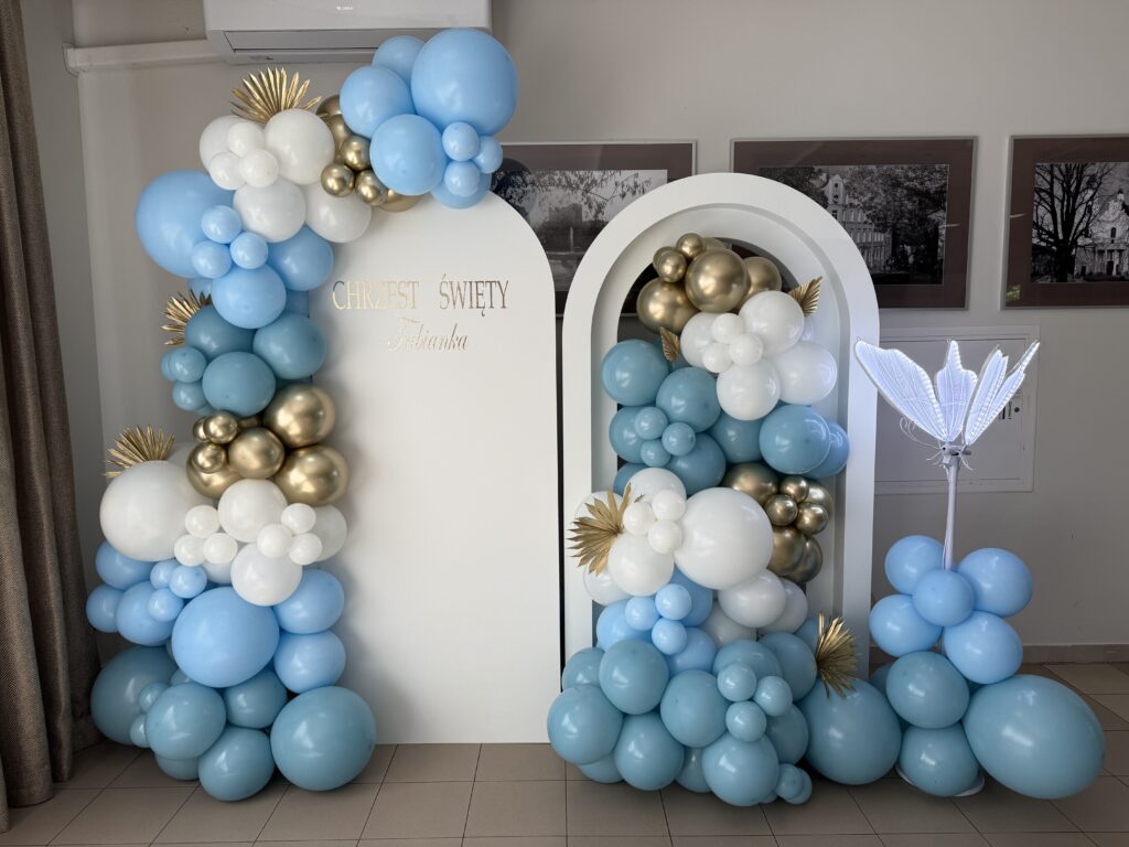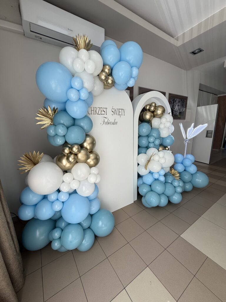 ✨ Balonowe kompozycje w odcieniach niebieskiego, bieli i złota – symbolizujące czystość, radość i wyjątkowość chwili.