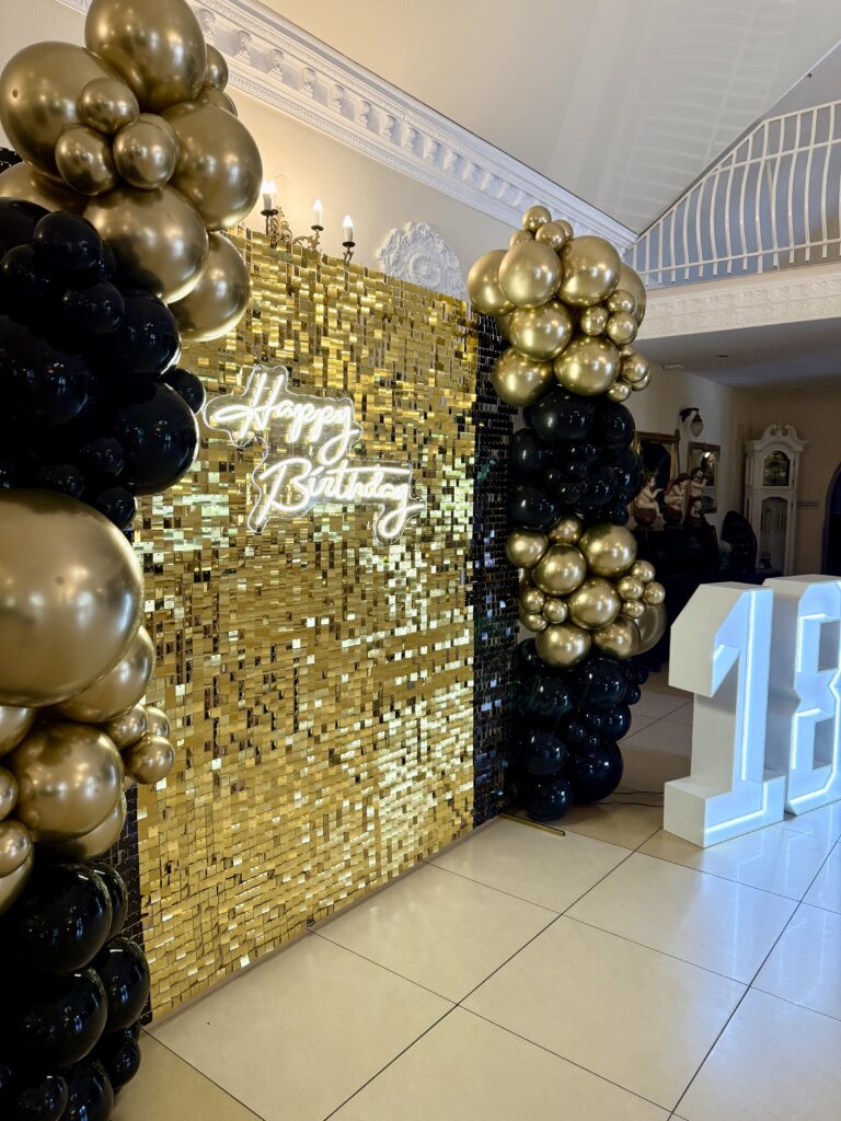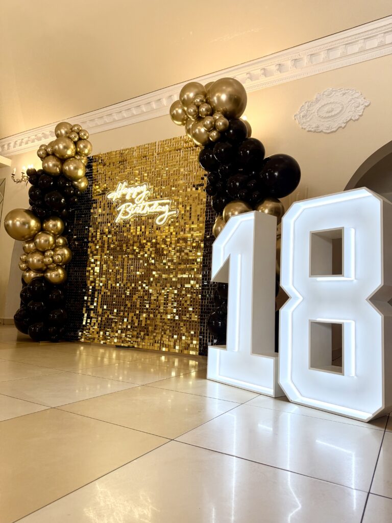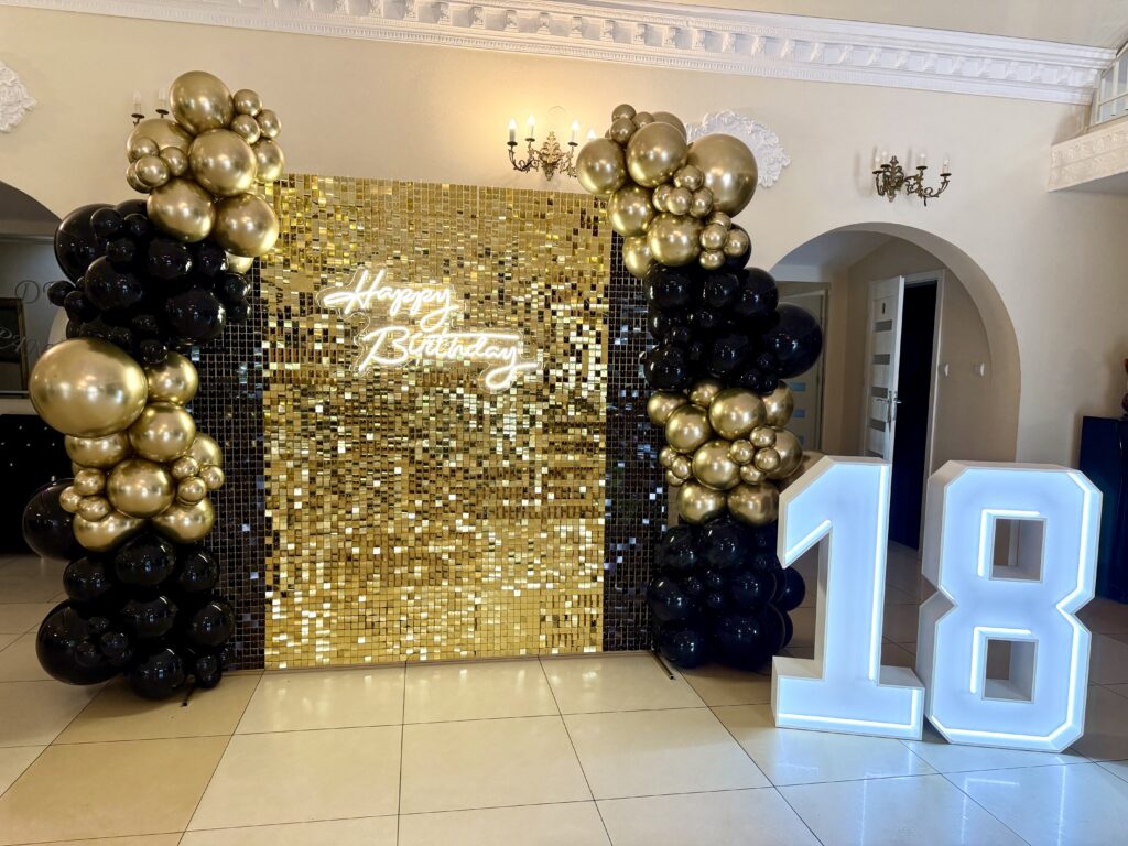Nasza propozycja dekoracji na 18. urodziny łączy elegancję, blask i nowoczesny styl. Postawiliśmy na połączenie czerni i złota – duet, który zawsze prezentuje się luksusowo i robi niesamowite wrażenie na gościach.