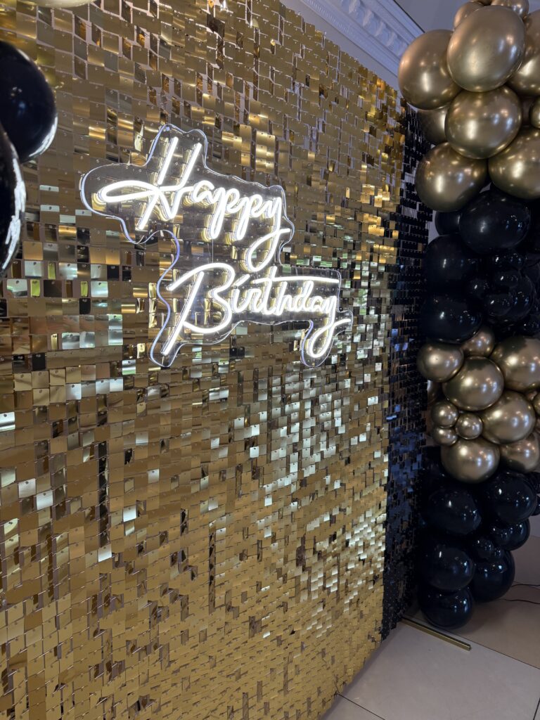 Neon „Happy Birthday” – subtelne, ale niezwykle efektowne podświetlenie, które tworzy magiczną atmosferę.