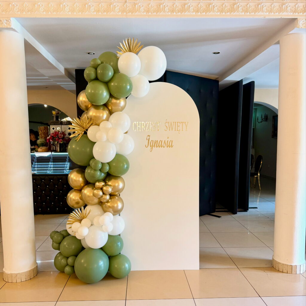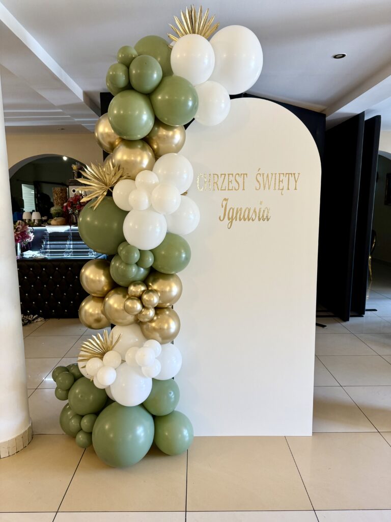 Kompozycja balonowa w odcieniach zieleni, złota i bieli – zestawienie kolorów symbolizujących spokój, czystość i radość.