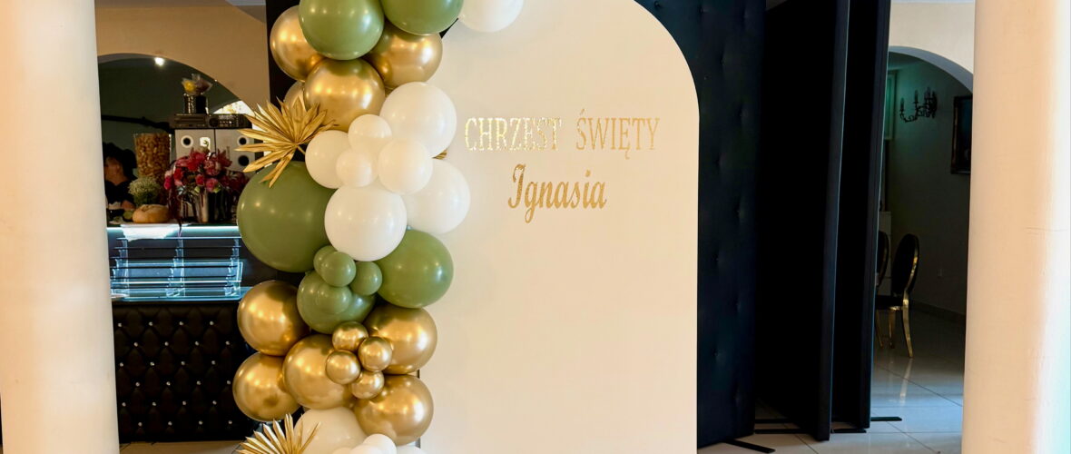 Klasyczna biała ścianka z personalizowanym napisem „Chrzest Święty Ignasia” – idealne tło do rodzinnych fotografii.
