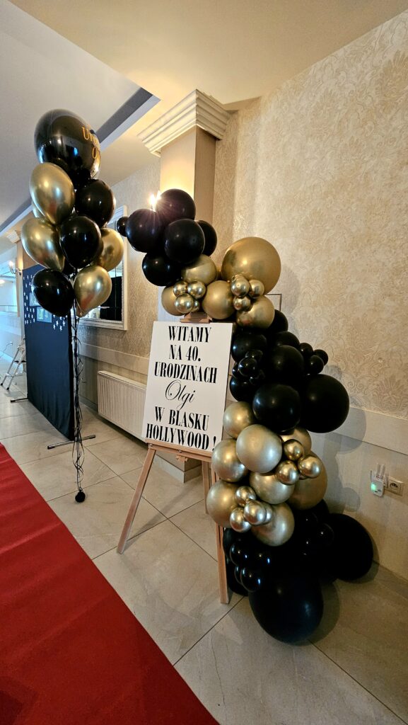 Kiedy marzysz o przyjęciu z prawdziwym efektem WOW – sięgasz po klasykę glamour: złoto, czerń i… czerwony dywan! Tak właśnie wyglądały 40. urodziny Olgi, które miały miejsce w iście filmowym stylu. Cała dekoracja była przemyślana w najdrobniejszych detalach i zamieniła salę w prawdziwą hollywoodzką scenę!