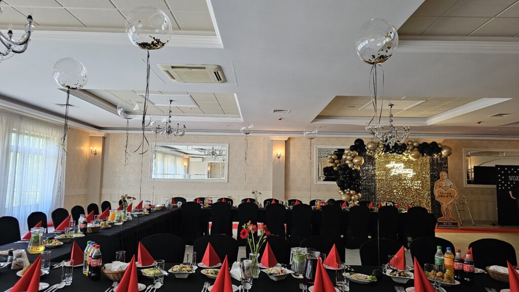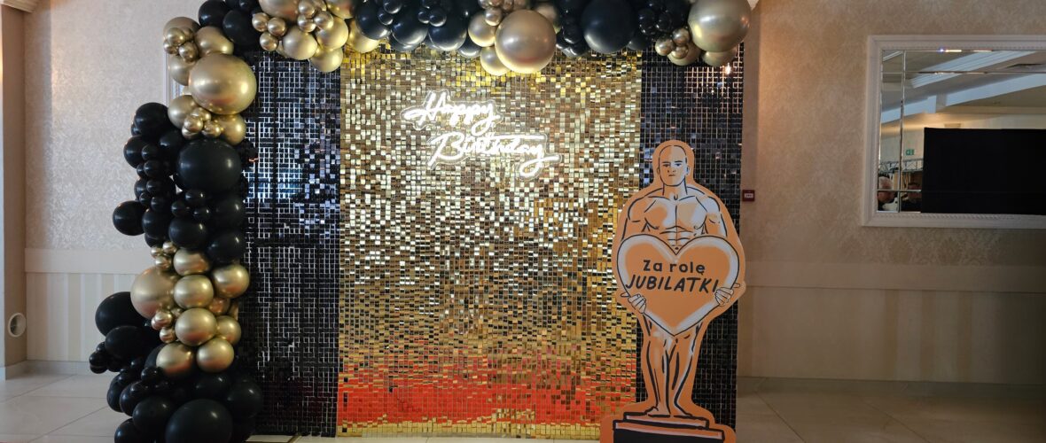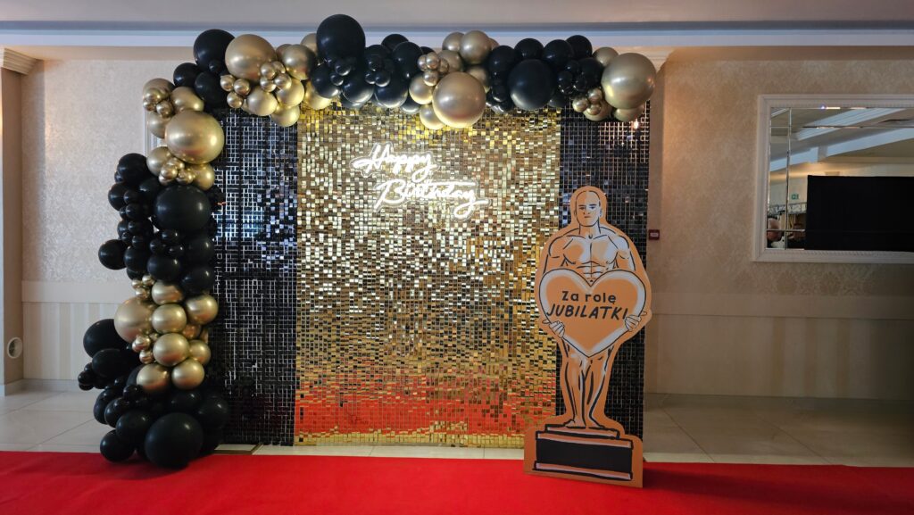 Punktem kulminacyjnym była błyszcząca, złoto-czarna ścianka cekinowa, idealna do zdjęć. Otoczona okazałą kompozycją balonową, tworzyła luksusową strefę fotograficzną – niczym z hollywoodzkiej gali. Goście chętnie pozowali na tle czerwonego dywanu, czując się jak prawdziwe gwiazdy.