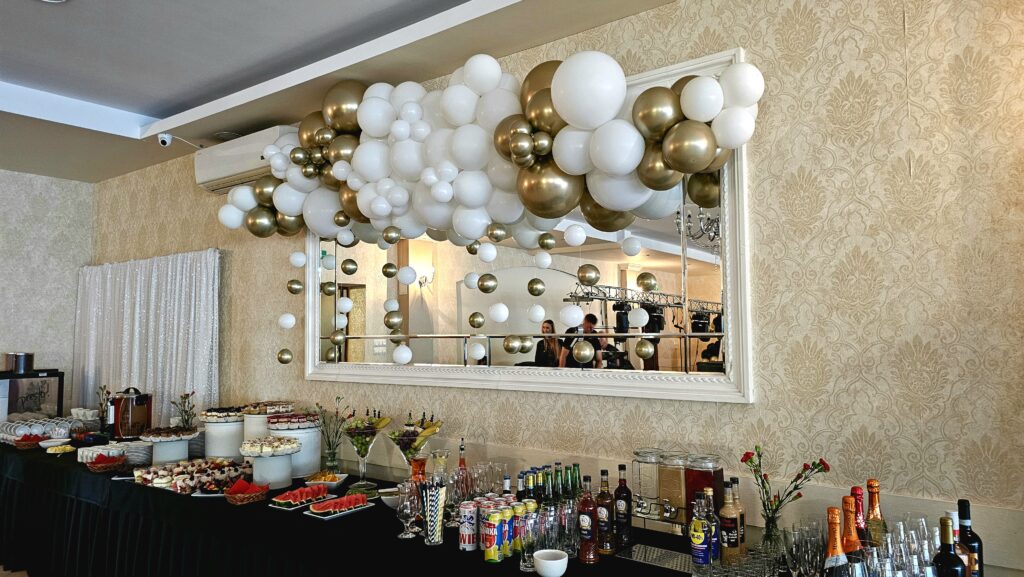 Dekoracje nie kończyły się na wejściu. W strefie bufetowej nad długim stołem zawisła elegancka girlanda „chmurka” z białych i złotych balonów, które dodatkowo „spływały” w dół w postaci lekkich kuleczek – imitujących efekt kropli deszczu. Całość została umieszczona nad stylowym lustrem, co wizualnie powiększyło przestrzeń i podwoiło efekt WOW.