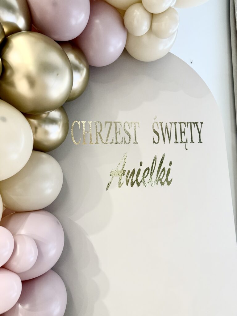 Na jasnym tle pojawił się napis „Chrzest Święty Anielki” wykonany złotą czcionką, co sprawiło, że dekoracja była jeszcze bardziej wyjątkowa i spersonalizowana. To właśnie ten detal sprawił, że całość nabrała indywidualnego, bardzo osobistego charakteru.
