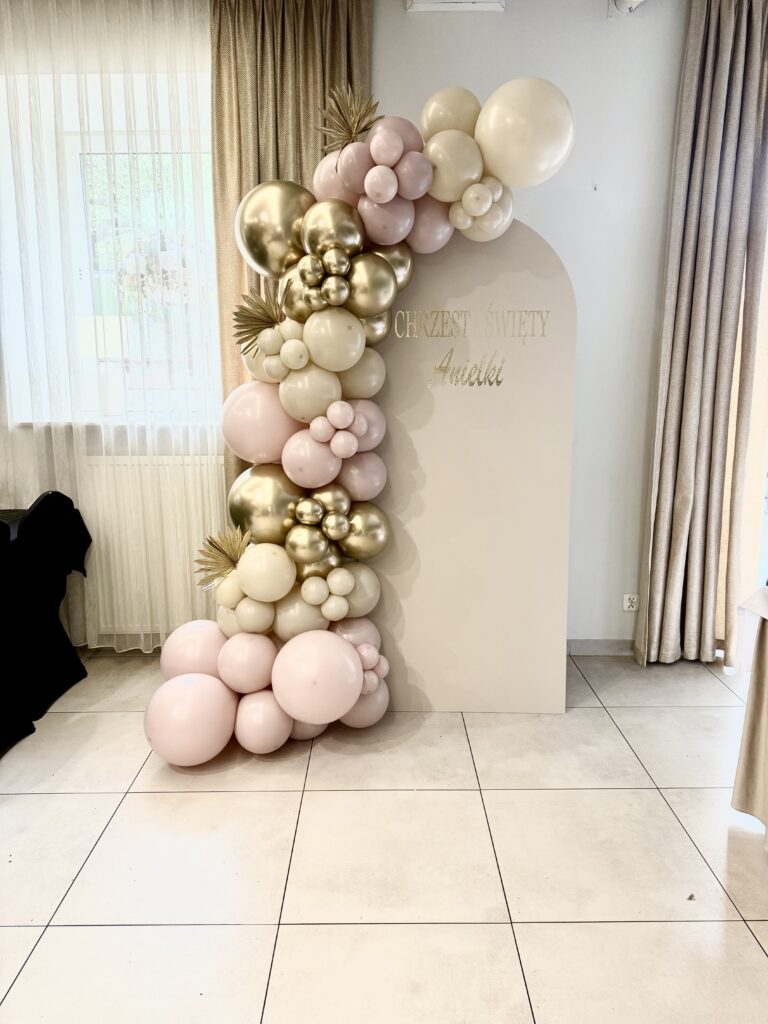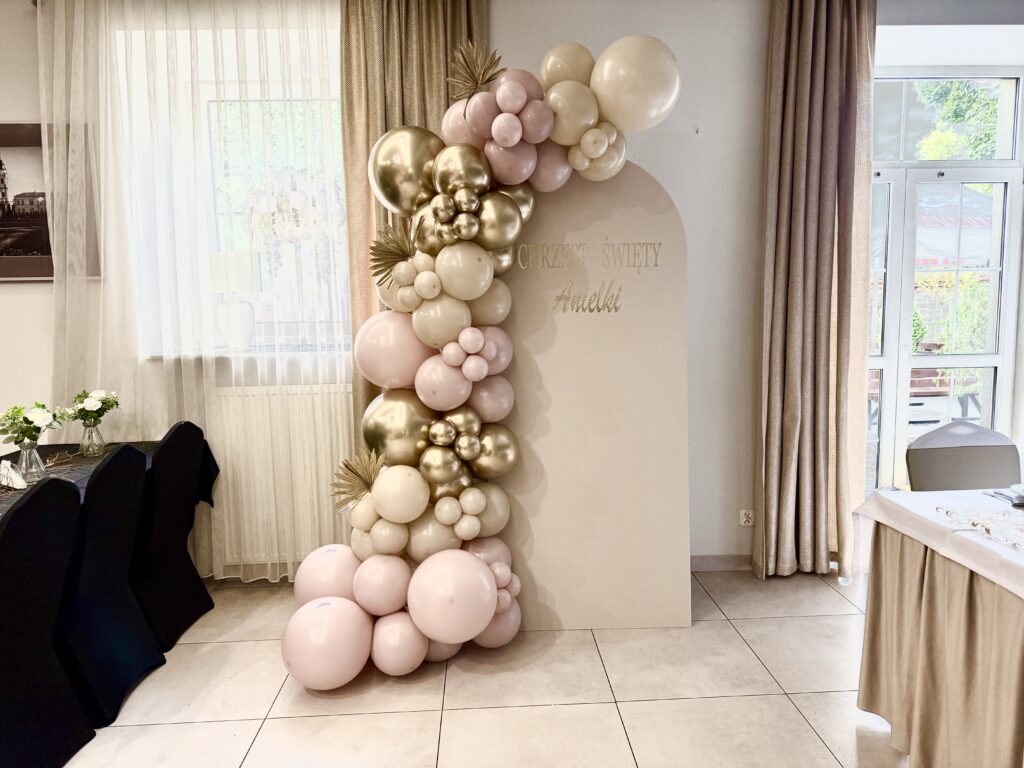 Największą ozdobą była organiczna girlanda balonowa oplatająca ściankę z imieniem Anielki. Różne rozmiary balonów sprawiły, że całość wyglądała lekko i naturalnie. Złote, połyskujące akcenty dodały dekoracji elegancji i podniosłego charakteru, a złote liście wplecione w aranżację nadały jej nowoczesnego designu.