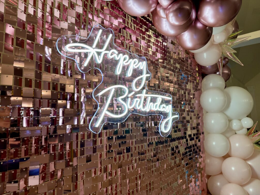 - neonowy napis „Happy Birthday”, który przyciąga wzrok i pięknie prezentuje się na zdjęciach