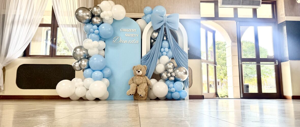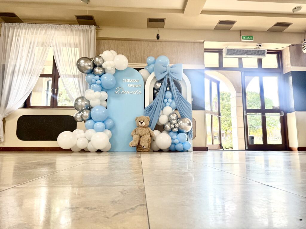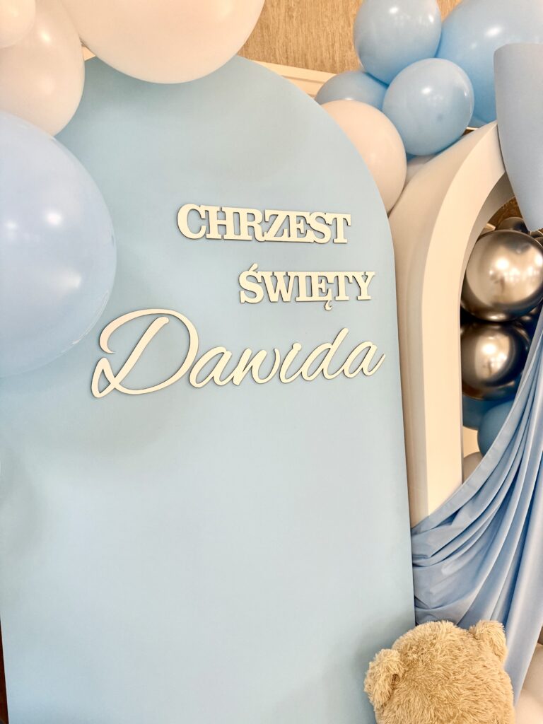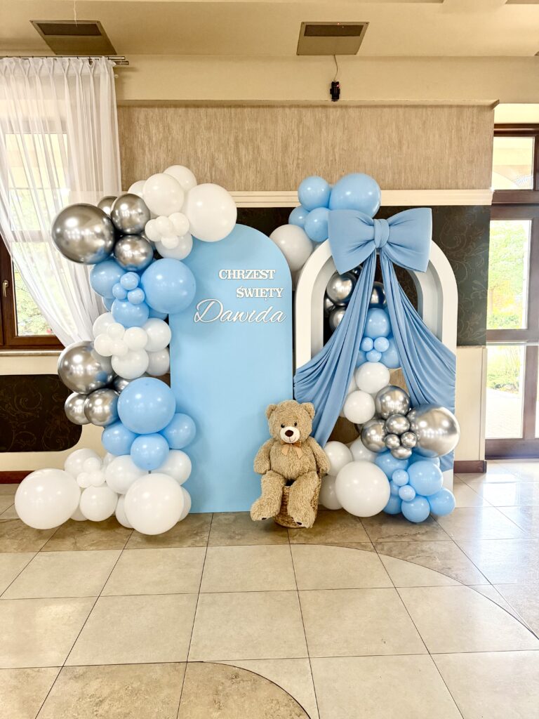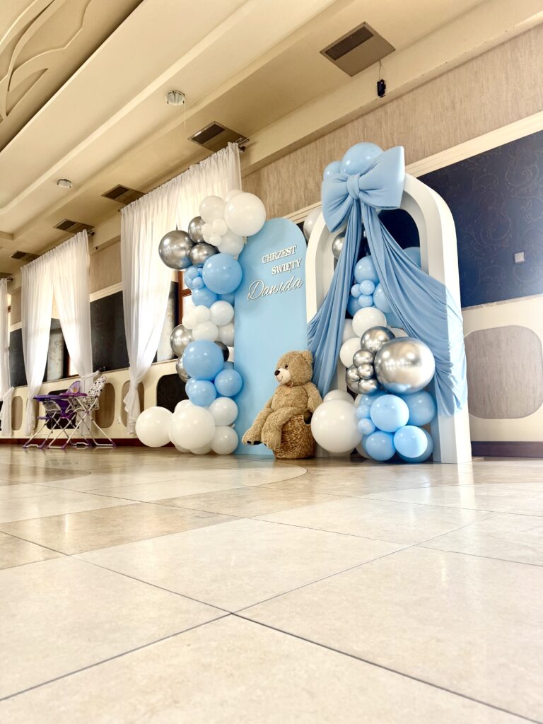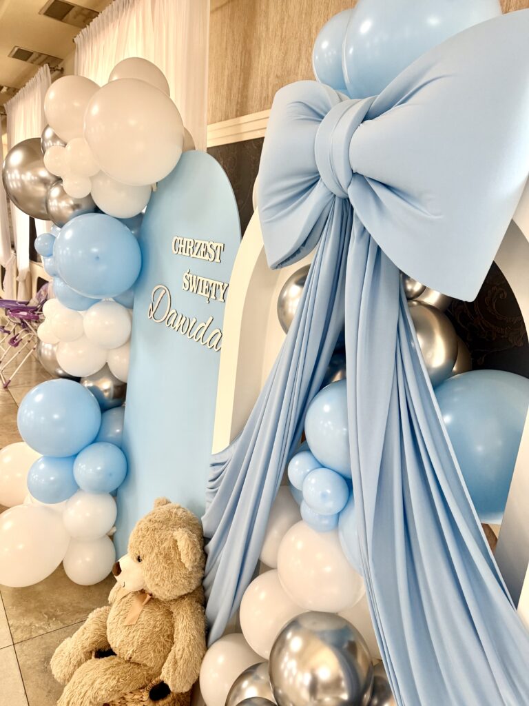 Chrzest Święty to wyjątkowy i pełen wzruszeń dzień, który zasługuje na piękną, spójną oprawę. Prezentowana ścianka dekoracyjna na Chrzest Święty zachwyca subtelną kolorystyką błękitu, bieli oraz srebrnych akcentów, idealnie wpisując się w charakter tej uroczystości.