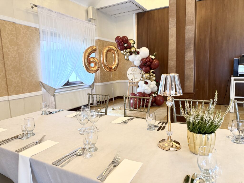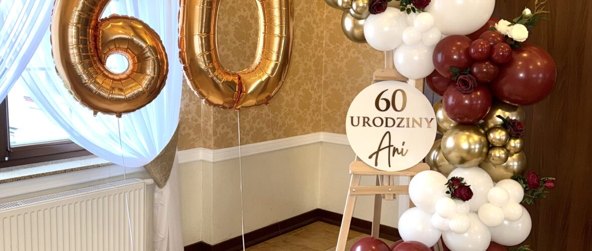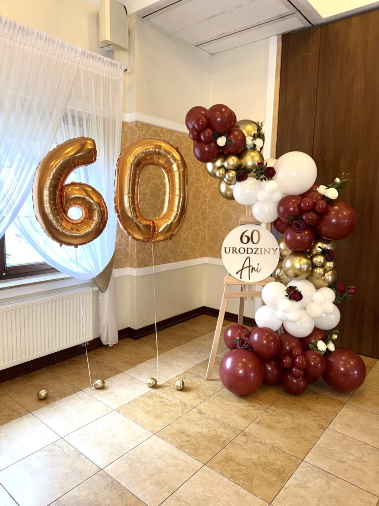 Stylowa, a jednocześnie efektowna – taka właśnie jest ścianka balonowa na sztaludze, idealna na jubileusze i wyjątkowe urodziny. Prezentowana aranżacja została przygotowana z okazji 60. urodzin, łącząc bordo, biel oraz złote akcenty, które nadają całości luksusowego charakteru.
